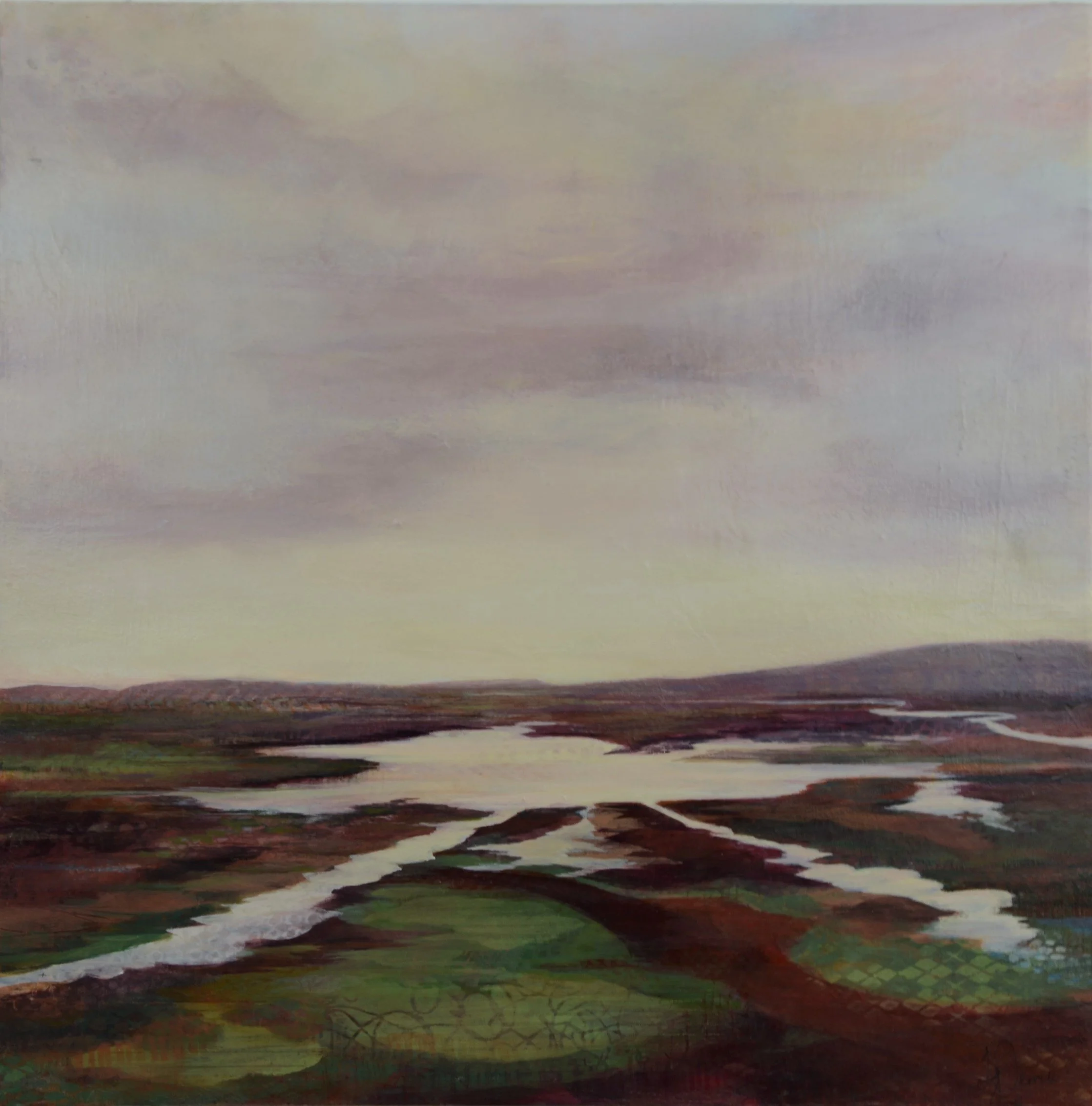 This piece has a feeling of calm and stillness, seen in the peaceful sky and the reflections from the flooded fields. However the warm colour palette of alizarin crimson, dusky pinks, rusty ochres and soft greens create a warm glow of joyousness. The landscape is made from layers of thin and opaque paint, with beautiful patterns and surface textures that can be reminiscent of another place entirely.